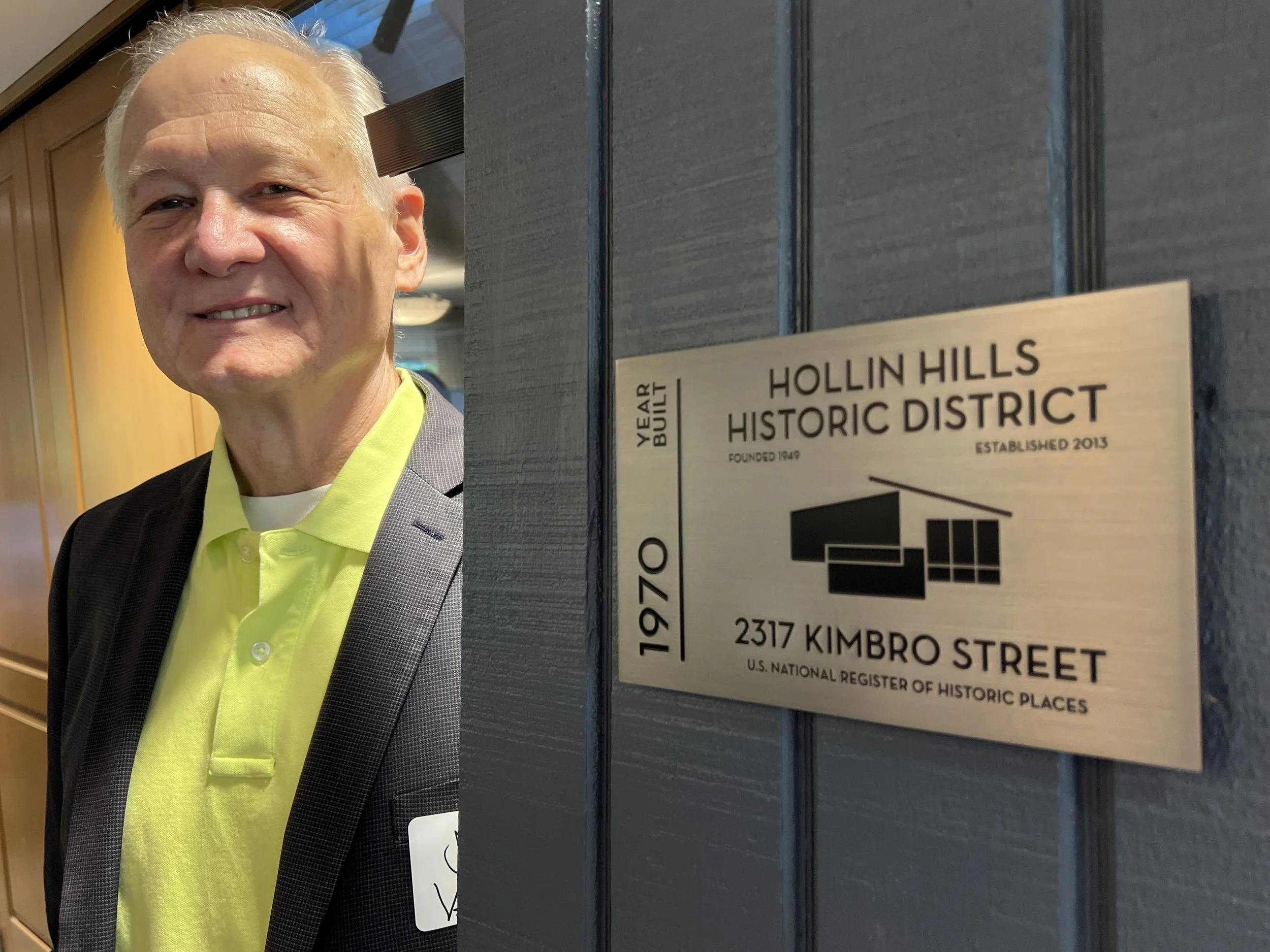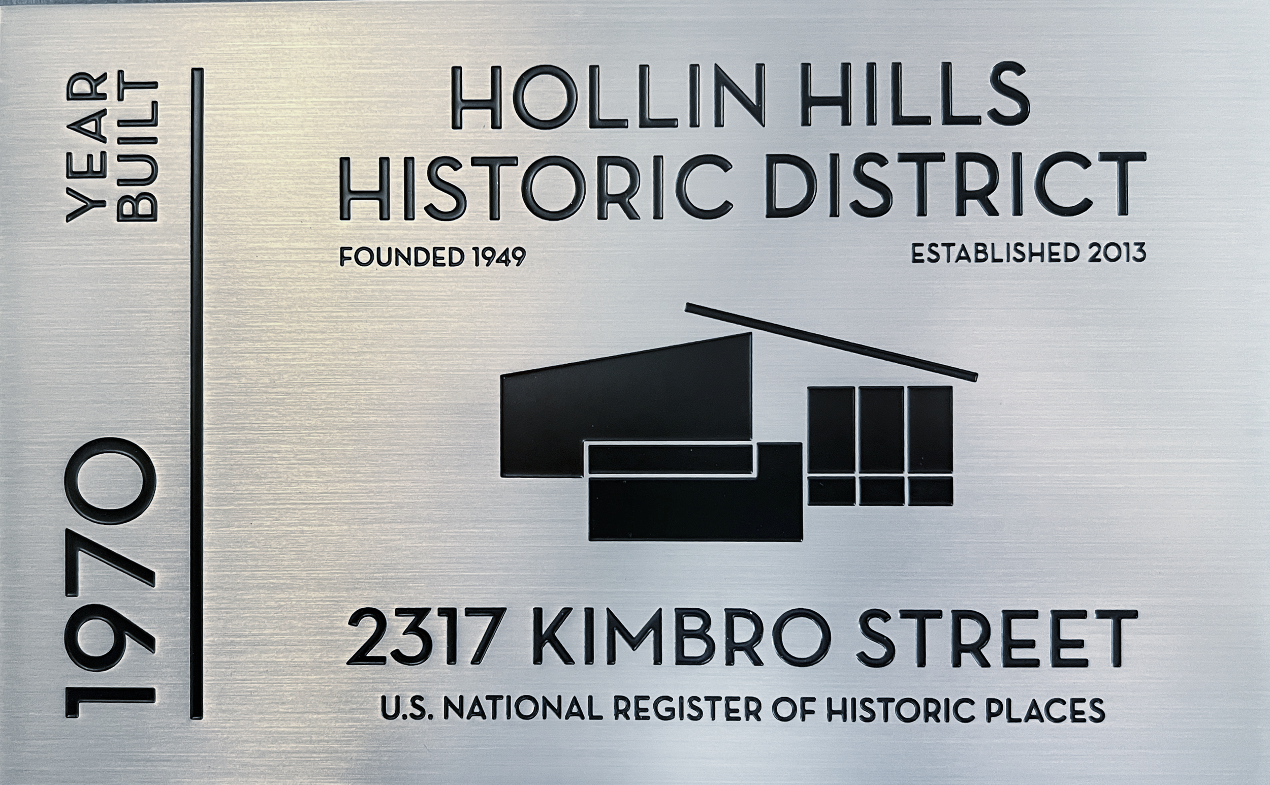 Instead, the plaques — like Hollin Hillers themselves — embody sophistication and subtle charm. They’re made of 1/8-inch brushed stainless steel, designed to sit lightly against the exterior siding, as if floating. At the center, a stylized Hollin Hills house—which seems uncannily close to the FOHH logo—anchors the design, while the words “HOLLIN HILLS HISTORIC DISTRICT” sit cleanly across the top, with the community’s 1949 founding date and its 2013 entry into the U.S. National Register of Historic Places underneath.
